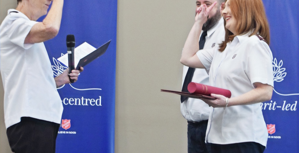 Commissioner Miriam Gluyas commissions Alli and Liam as officers of The Salvation Army.